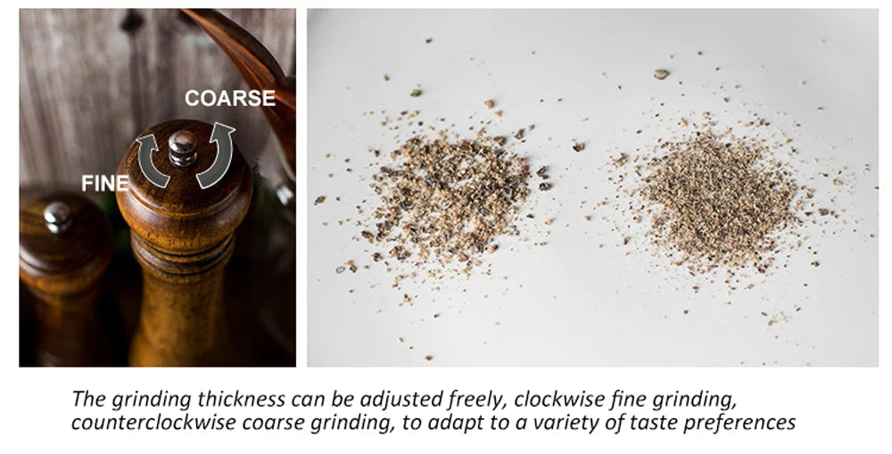 Bring timeless style to your kitchen or dining table with this solid wood salt and pepper grinder, available in 5-inch, 8-inch, or 10-inch sizes. Designed with a strong ceramic grinding core, it delivers smooth, adjustable grinding for both coarse and fine seasoning—perfect for sea salt, peppercorns, and more.